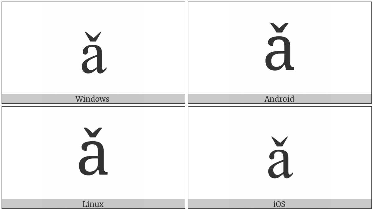 The image below shows how the “Latin Small Letter A With Caron” symbol might look like on different operating systems. If the font in which this web site is displayed does not contain the symbol and there is no fallback font able to render it, you can use the image below to get an idea of what it should look like.