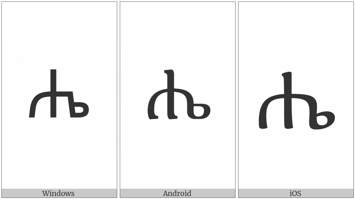 The image below shows how the “Ethiopic Syllable Hhee” symbol might look like on different operating systems. If the font in which this web site is displayed does not contain the symbol and there is no fallback font able to render it, you can use the image below to get an idea of what it should look like.