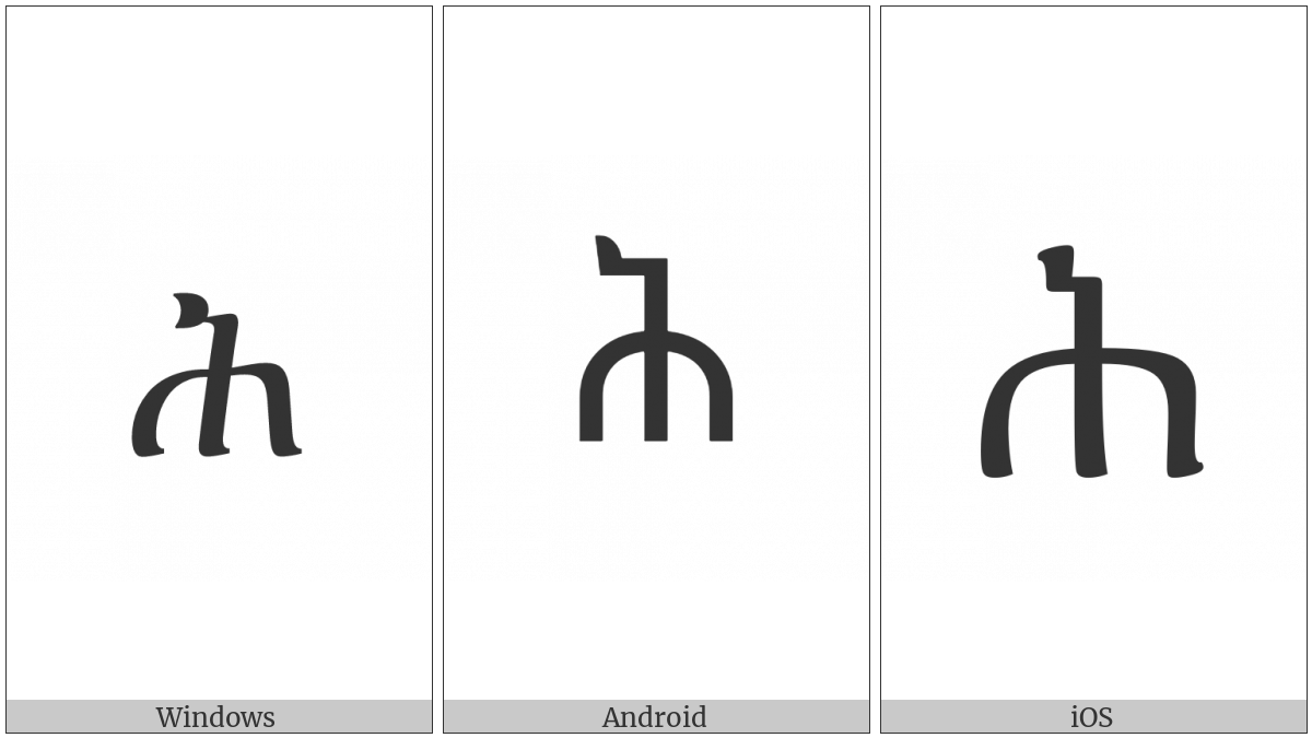 The image below shows how the “Ethiopic Syllable Hhe” symbol might look like on different operating systems. If the font in which this web site is displayed does not contain the symbol and there is no fallback font able to render it, you can use the image below to get an idea of what it should look like.