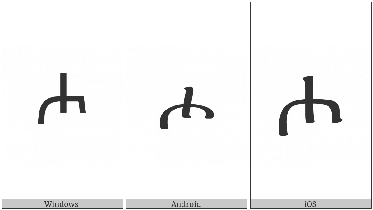 The image below shows how the “Ethiopic Syllable Hho” symbol might look like on different operating systems. If the font in which this web site is displayed does not contain the symbol and there is no fallback font able to render it, you can use the image below to get an idea of what it should look like.
