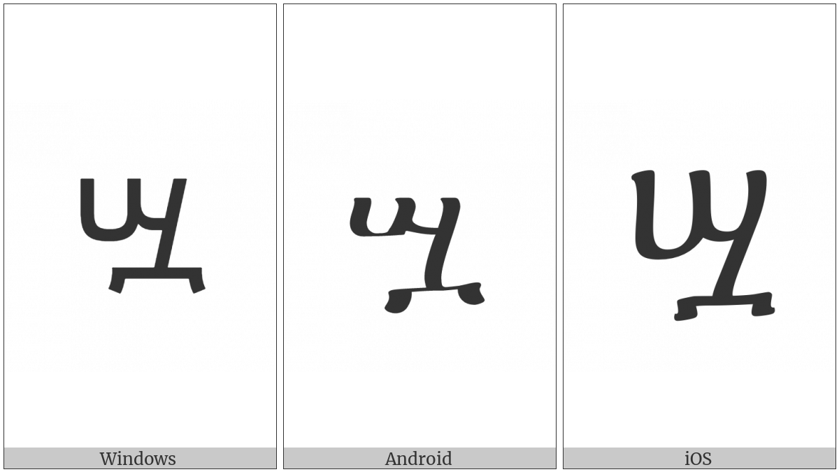 The image below shows how the “Ethiopic Syllable Szwa” symbol might look like on different operating systems. If the font in which this web site is displayed does not contain the symbol and there is no fallback font able to render it, you can use the image below to get an idea of what it should look like.