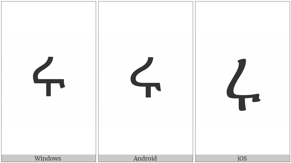 The image below shows how the “Ethiopic Syllable Ru” symbol might look like on different operating systems. If the font in which this web site is displayed does not contain the symbol and there is no fallback font able to render it, you can use the image below to get an idea of what it should look like.