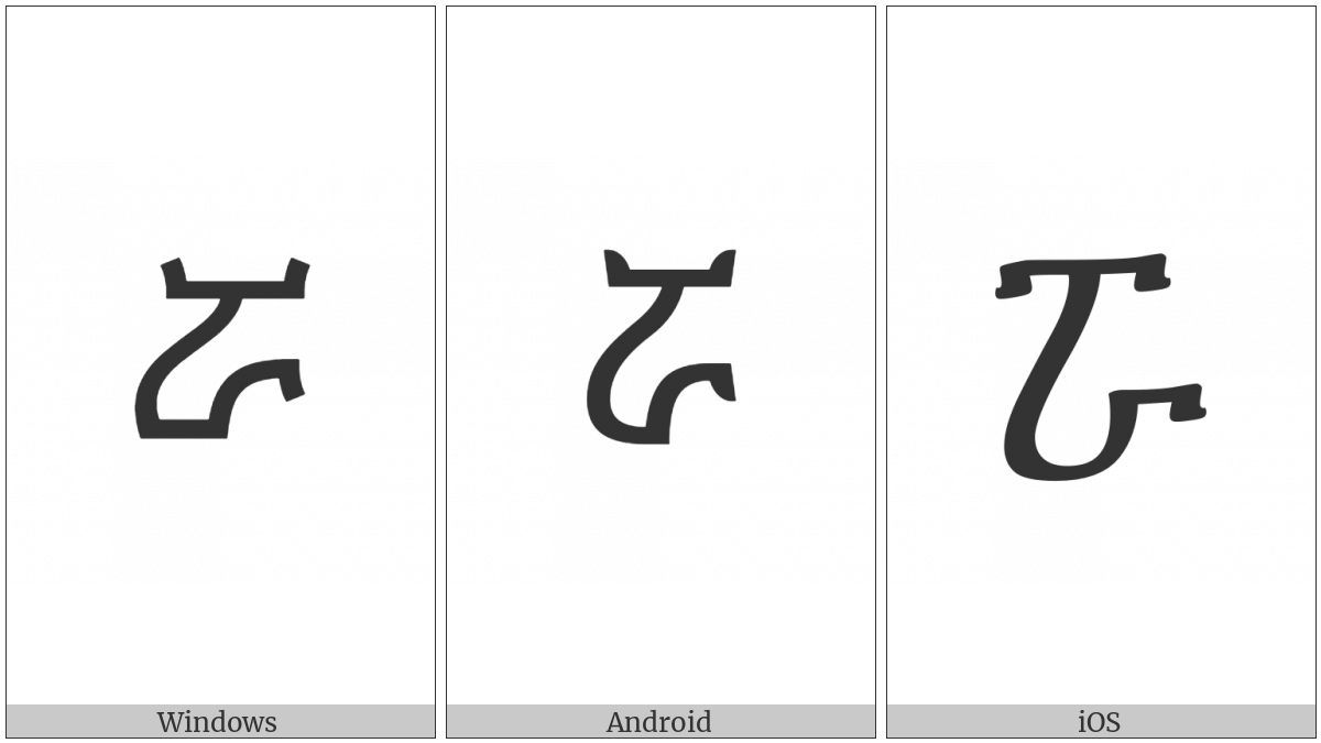 The image below shows how the “Ethiopic Syllable Rwa” symbol might look like on different operating systems. If the font in which this web site is displayed does not contain the symbol and there is no fallback font able to render it, you can use the image below to get an idea of what it should look like.