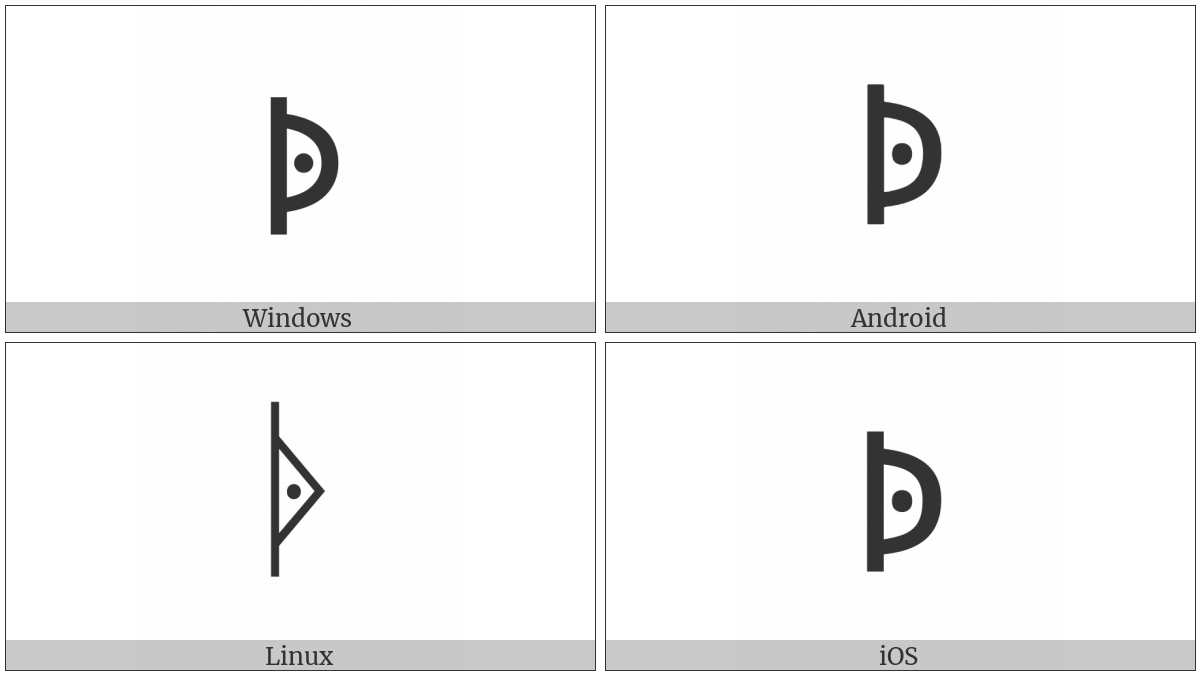 The image below shows how the “Runic Letter Eth” symbol might look like on different operating systems. If the font in which this web site is displayed does not contain the symbol and there is no fallback font able to render it, you can use the image below to get an idea of what it should look like.