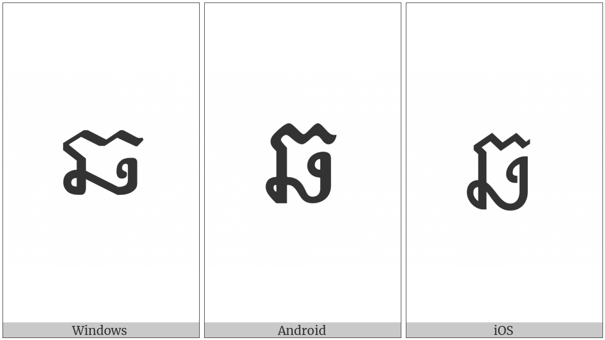 The image below shows how the “Khmer Letter Cha” symbol might look like on different operating systems. If the font in which this web site is displayed does not contain the symbol and there is no fallback font able to render it, you can use the image below to get an idea of what it should look like.