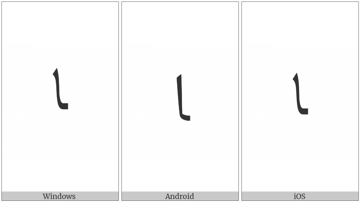 The image below shows how the “Arabic Letter Alef Final Form” symbol might look like on different operating systems. If the font in which this web site is displayed does not contain the symbol and there is no fallback font able to render it, you can use the image below to get an idea of what it should look like.
