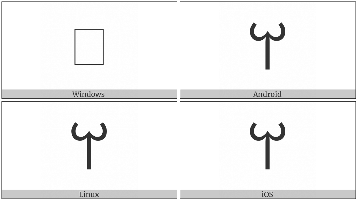 The image below shows how the “Linear B Syllable B026 Ru” symbol might look like on different operating systems. If the font in which this web site is displayed does not contain the symbol and there is no fallback font able to render it, you can use the image below to get an idea of what it should look like.