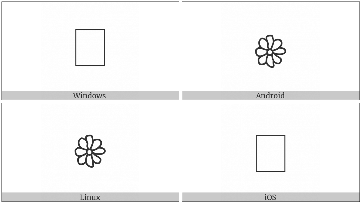 The image below shows how the “Phaistos Disc Sign Rosette” symbol might look like on different operating systems. If the font in which this web site is displayed does not contain the symbol and there is no fallback font able to render it, you can use the image below to get an idea of what it should look like.