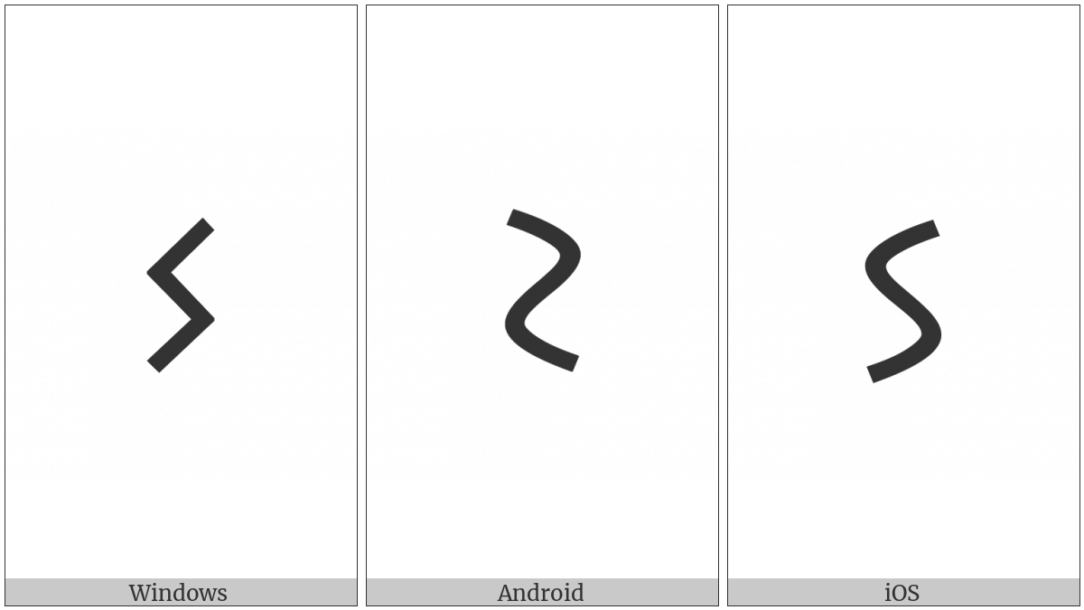 The image below shows how the “Old Italic Letter Es” symbol might look like on different operating systems. If the font in which this web site is displayed does not contain the symbol and there is no fallback font able to render it, you can use the image below to get an idea of what it should look like.