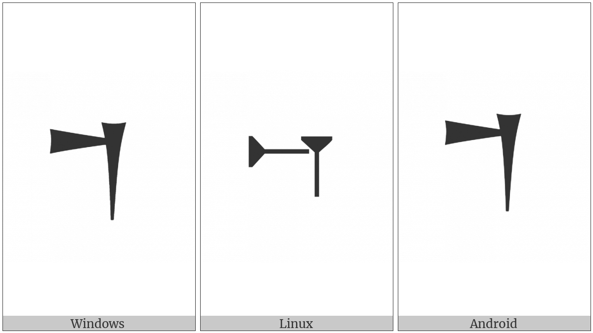 The image below shows how the “Ugaritic Letter Mem” symbol might look like on different operating systems. If the font in which this web site is displayed does not contain the symbol and there is no fallback font able to render it, you can use the image below to get an idea of what it should look like.
