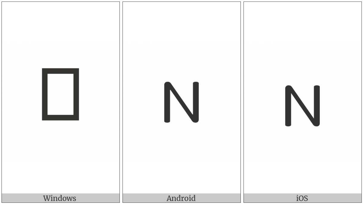 The image below shows how the “Elbasan Letter Ne” symbol might look like on different operating systems. If the font in which this web site is displayed does not contain the symbol and there is no fallback font able to render it, you can use the image below to get an idea of what it should look like.