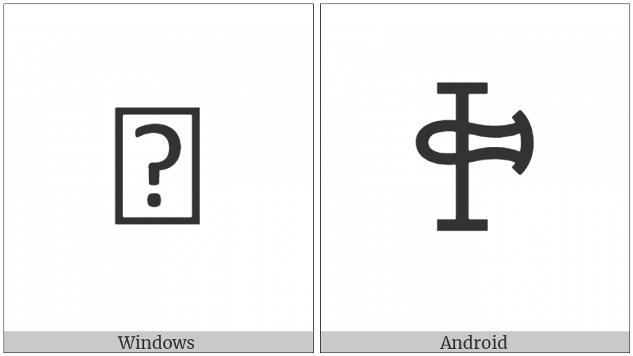 The image below shows how the “Linear A Sign A363” symbol might look like on different operating systems. If the font in which this web site is displayed does not contain the symbol and there is no fallback font able to render it, you can use the image below to get an idea of what it should look like.