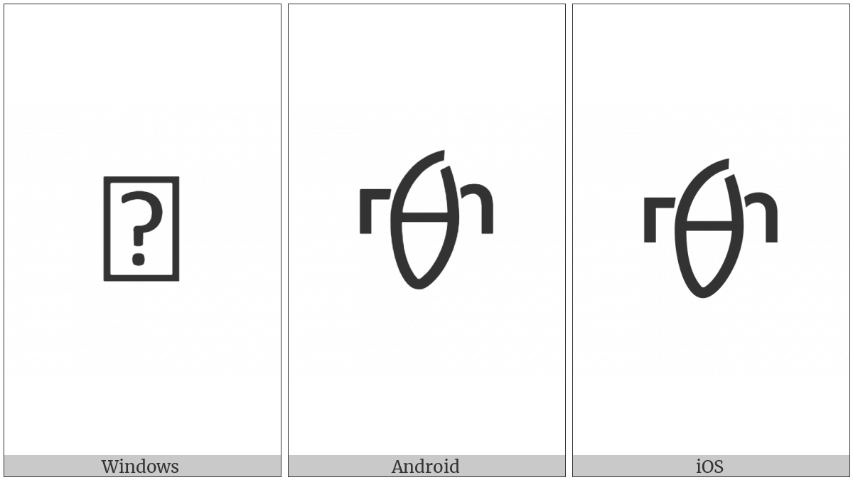 The image below shows how the “Linear A Sign A367” symbol might look like on different operating systems. If the font in which this web site is displayed does not contain the symbol and there is no fallback font able to render it, you can use the image below to get an idea of what it should look like.