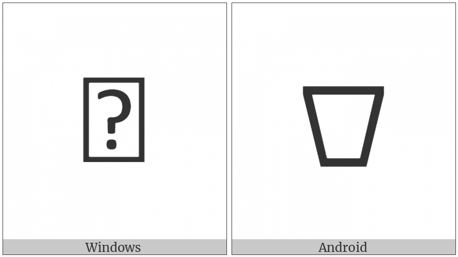The image below shows how the “Linear A Sign A402-Vas” symbol might look like on different operating systems. If the font in which this web site is displayed does not contain the symbol and there is no fallback font able to render it, you can use the image below to get an idea of what it should look like.