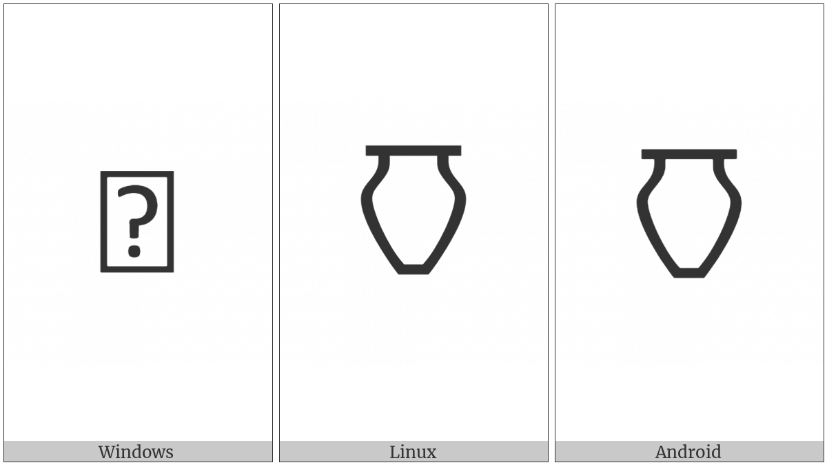 The image below shows how the “Linear A Sign A415-Vas” symbol might look like on different operating systems. If the font in which this web site is displayed does not contain the symbol and there is no fallback font able to render it, you can use the image below to get an idea of what it should look like.
