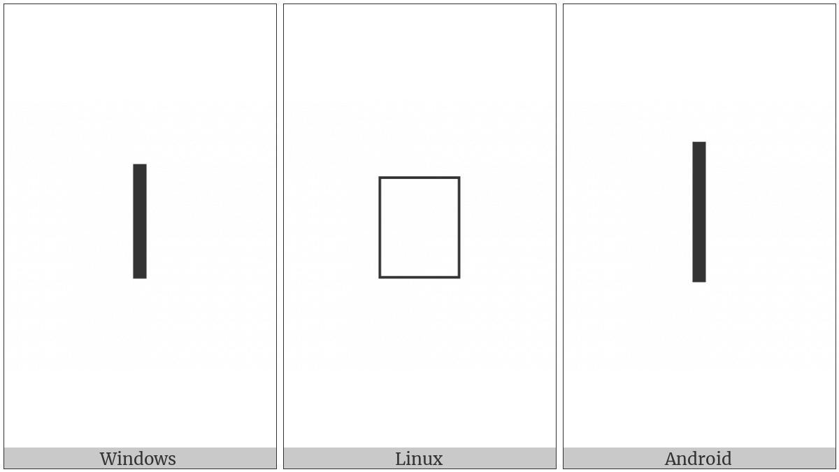 The image below shows how the “Old South Arabian Number One” symbol might look like on different operating systems. If the font in which this web site is displayed does not contain the symbol and there is no fallback font able to render it, you can use the image below to get an idea of what it should look like.