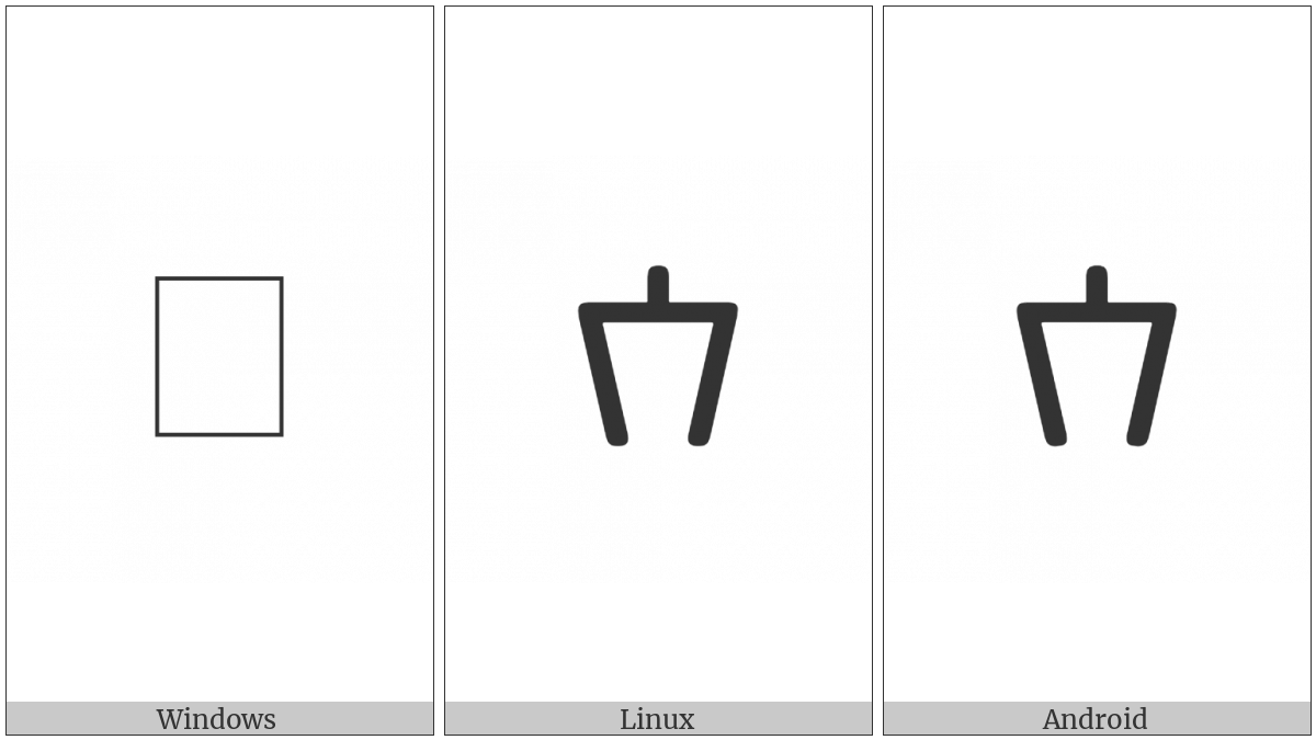 The image below shows how the “Old North Arabian Letter Es-1” symbol might look like on different operating systems. If the font in which this web site is displayed does not contain the symbol and there is no fallback font able to render it, you can use the image below to get an idea of what it should look like.