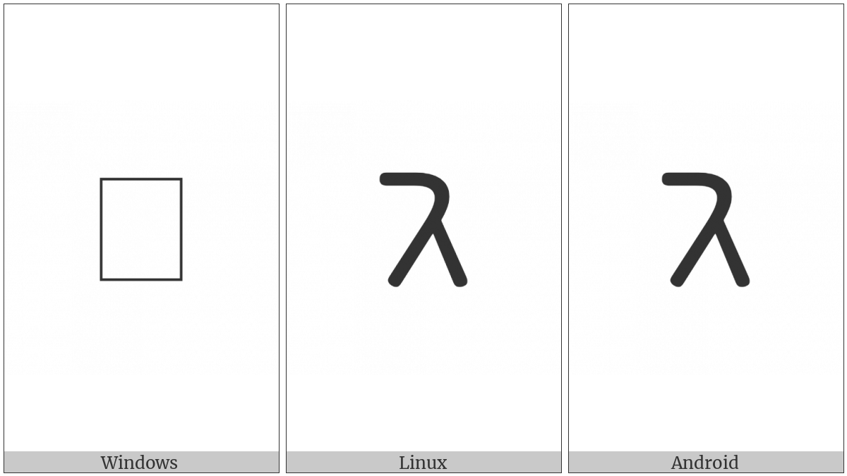 The image below shows how the “Old North Arabian Letter Khah” symbol might look like on different operating systems. If the font in which this web site is displayed does not contain the symbol and there is no fallback font able to render it, you can use the image below to get an idea of what it should look like.