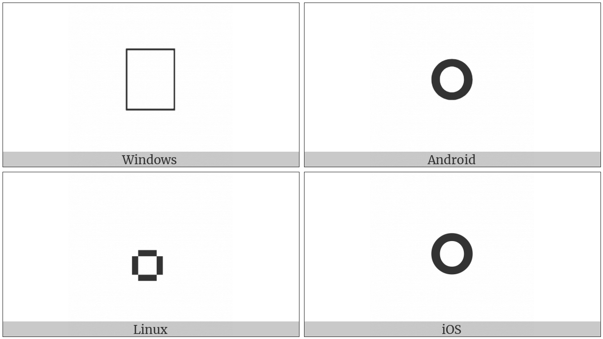 The image below shows how the “Old North Arabian Letter Ain” symbol might look like on different operating systems. If the font in which this web site is displayed does not contain the symbol and there is no fallback font able to render it, you can use the image below to get an idea of what it should look like.
