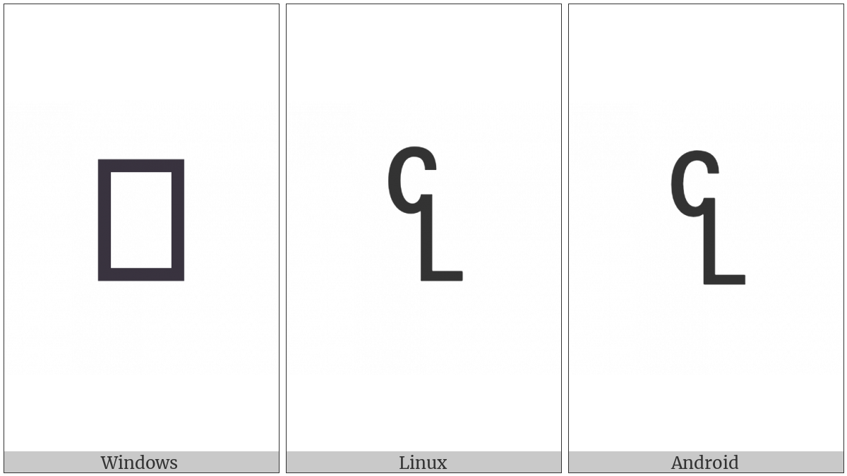 The image below shows how the “Sora Sompeng Letter Cah” symbol might look like on different operating systems. If the font in which this web site is displayed does not contain the symbol and there is no fallback font able to render it, you can use the image below to get an idea of what it should look like.