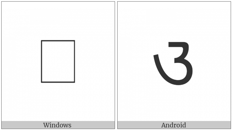 The image below shows how the “Sharada Letter U” symbol might look like on different operating systems. If the font in which this web site is displayed does not contain the symbol and there is no fallback font able to render it, you can use the image below to get an idea of what it should look like.