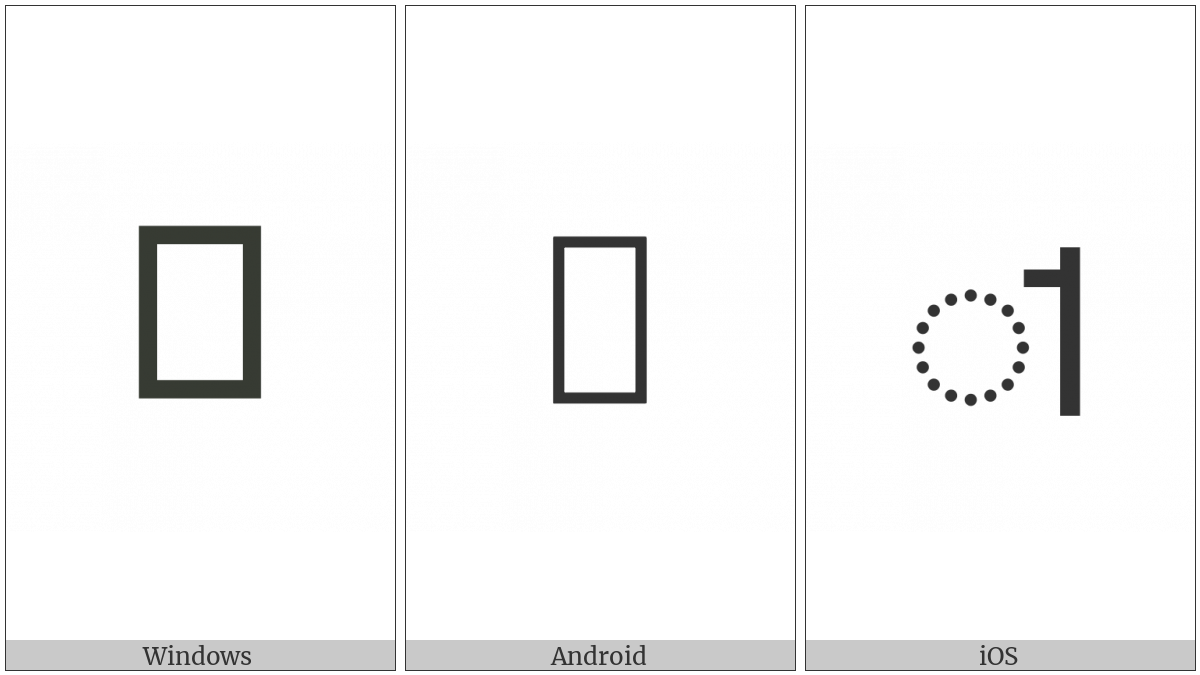 The image below shows how the “Sharada Sign Virama” symbol might look like on different operating systems. If the font in which this web site is displayed does not contain the symbol and there is no fallback font able to render it, you can use the image below to get an idea of what it should look like.