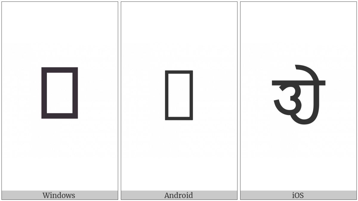 The image below shows how the “Modi Letter E” symbol might look like on different operating systems. If the font in which this web site is displayed does not contain the symbol and there is no fallback font able to render it, you can use the image below to get an idea of what it should look like.