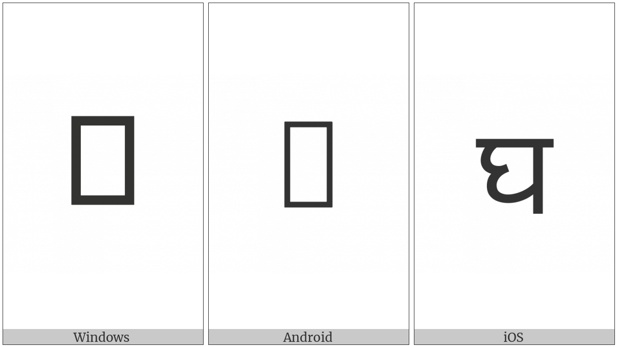 The image below shows how the “Modi Letter Gha” symbol might look like on different operating systems. If the font in which this web site is displayed does not contain the symbol and there is no fallback font able to render it, you can use the image below to get an idea of what it should look like.