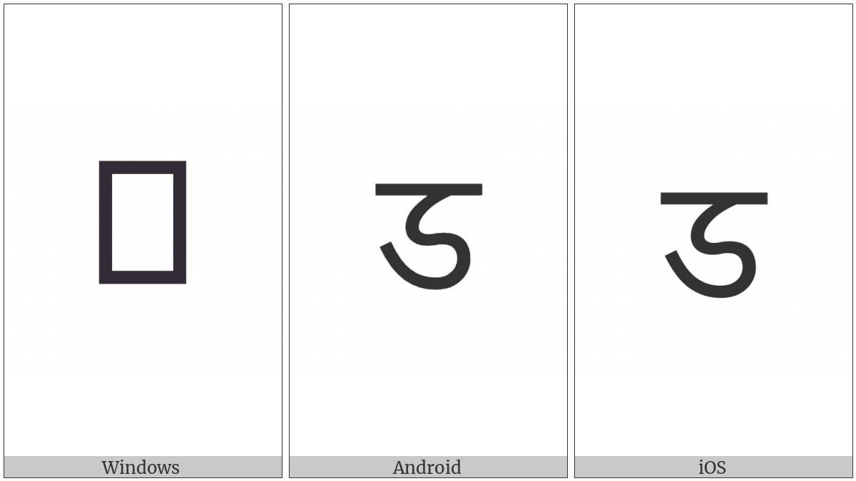 The image below shows how the “Modi Letter Dda” symbol might look like on different operating systems. If the font in which this web site is displayed does not contain the symbol and there is no fallback font able to render it, you can use the image below to get an idea of what it should look like.
