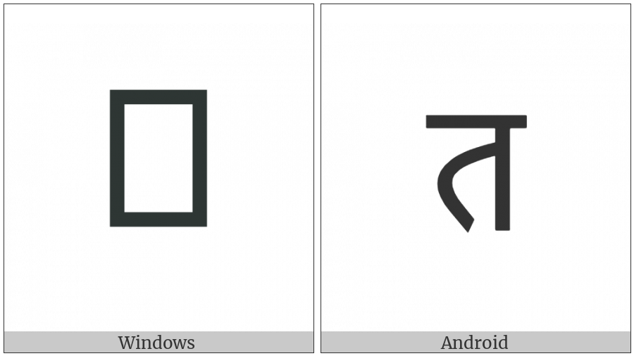 The image below shows how the “Modi Letter Ta” symbol might look like on different operating systems. If the font in which this web site is displayed does not contain the symbol and there is no fallback font able to render it, you can use the image below to get an idea of what it should look like.
