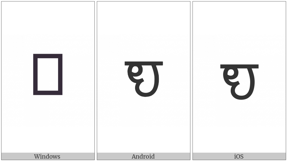 The image below shows how the “Modi Letter Dha” symbol might look like on different operating systems. If the font in which this web site is displayed does not contain the symbol and there is no fallback font able to render it, you can use the image below to get an idea of what it should look like.