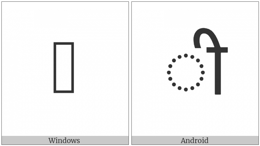 The image below shows how the “Modi Vowel Sign I” symbol might look like on different operating systems. If the font in which this web site is displayed does not contain the symbol and there is no fallback font able to render it, you can use the image below to get an idea of what it should look like.