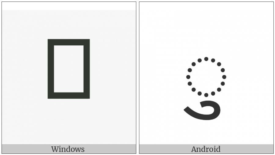 The image below shows how the “Modi Vowel Sign U” symbol might look like on different operating systems. If the font in which this web site is displayed does not contain the symbol and there is no fallback font able to render it, you can use the image below to get an idea of what it should look like.