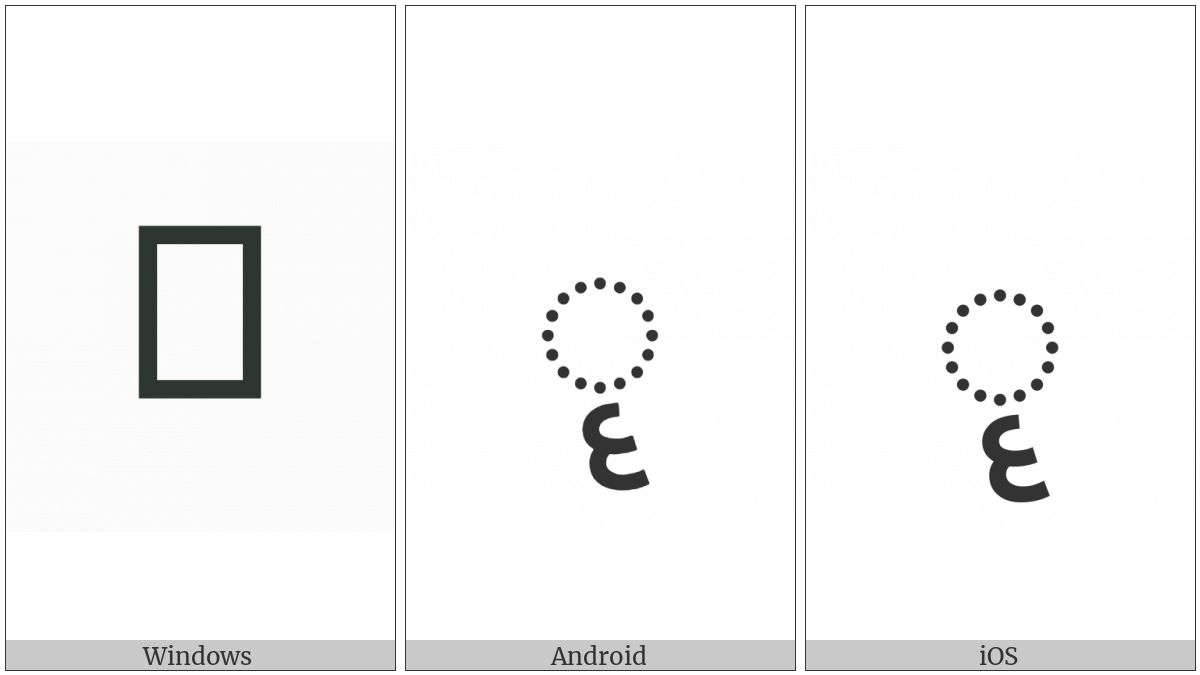 The image below shows how the “Modi Vowel Sign Vocalic Rr” symbol might look like on different operating systems. If the font in which this web site is displayed does not contain the symbol and there is no fallback font able to render it, you can use the image below to get an idea of what it should look like.