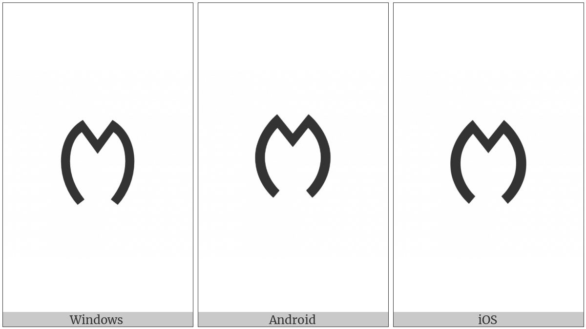 The image below shows how the “Ol Chiki Letter Unn” symbol might look like on different operating systems. If the font in which this web site is displayed does not contain the symbol and there is no fallback font able to render it, you can use the image below to get an idea of what it should look like.