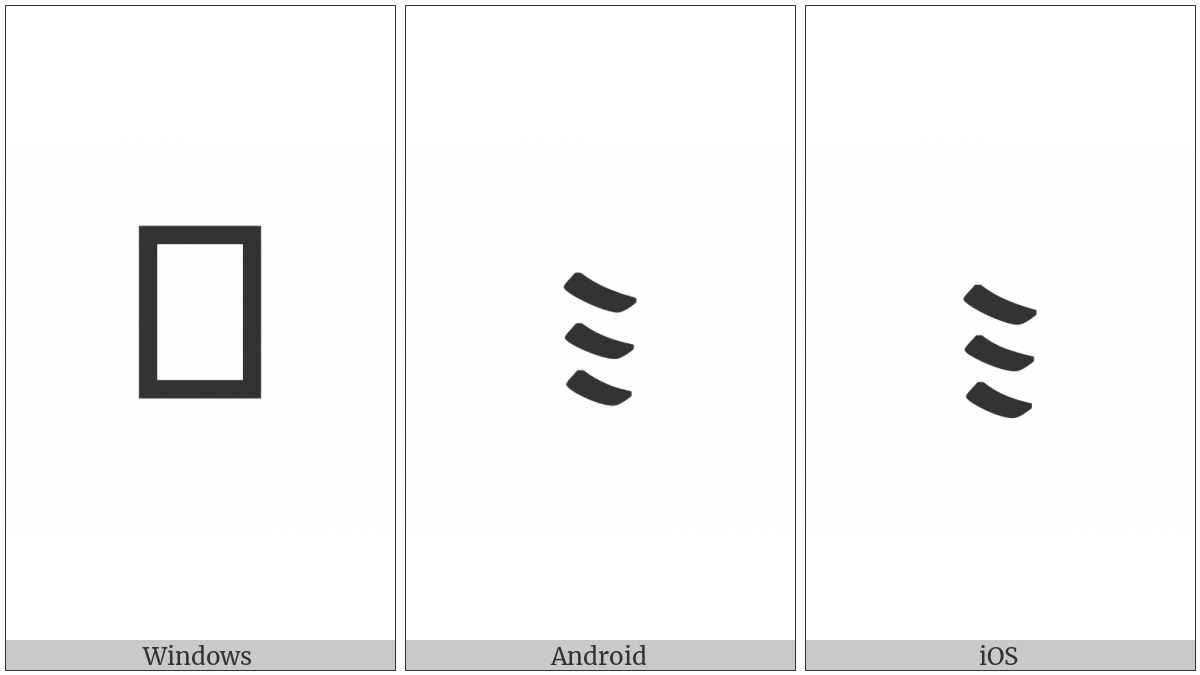 The image below shows how the “Bhaiksuki Gap Filler-1” symbol might look like on different operating systems. If the font in which this web site is displayed does not contain the symbol and there is no fallback font able to render it, you can use the image below to get an idea of what it should look like.