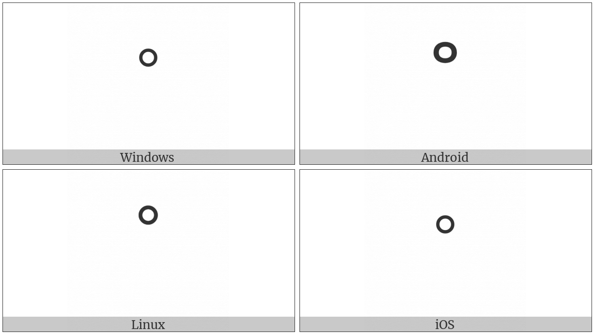 The image below shows how the “Ring Above” symbol might look like on different operating systems. If the font in which this web site is displayed does not contain the symbol and there is no fallback font able to render it, you can use the image below to get an idea of what it should look like.