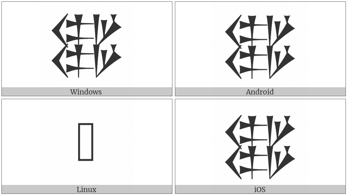 The image below shows how the “Cuneiform Sign U Over U Pa Over Pa Gar Over Gar” symbol might look like on different operating systems. If the font in which this web site is displayed does not contain the symbol and there is no fallback font able to render it, you can use the image below to get an idea of what it should look like.