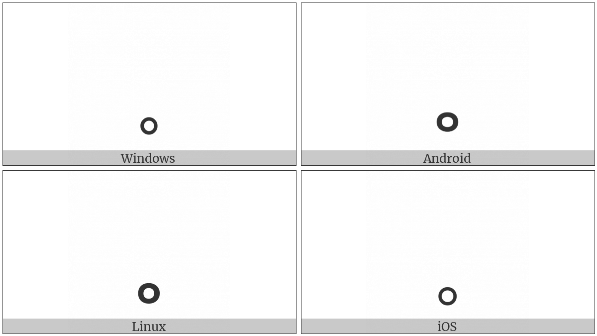 The image below shows how the “Modifier Letter Low Ring” symbol might look like on different operating systems. If the font in which this web site is displayed does not contain the symbol and there is no fallback font able to render it, you can use the image below to get an idea of what it should look like.