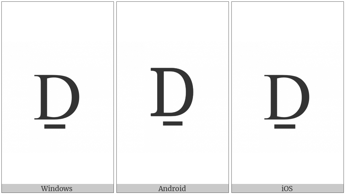 The image below shows how the “Latin Capital Letter D With Line Below” symbol might look like on different operating systems. If the font in which this web site is displayed does not contain the symbol and there is no fallback font able to render it, you can use the image below to get an idea of what it should look like.