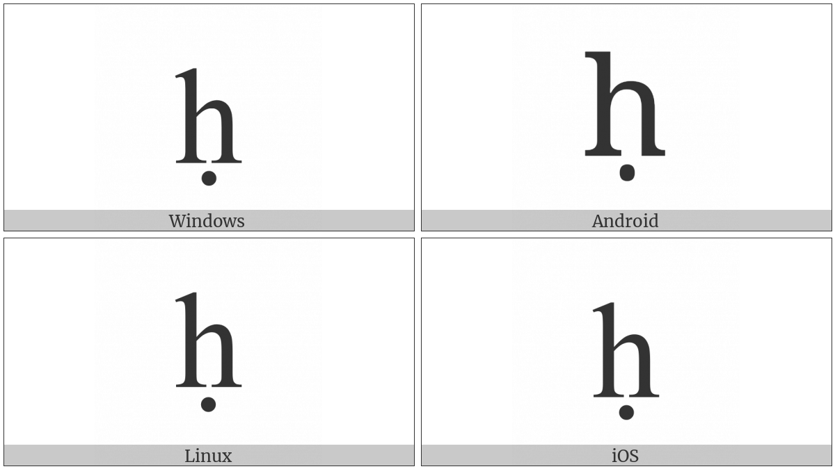 The image below shows how the “Latin Small Letter H With Dot Below” symbol might look like on different operating systems. If the font in which this web site is displayed does not contain the symbol and there is no fallback font able to render it, you can use the image below to get an idea of what it should look like.
