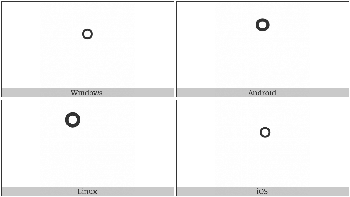 The image below shows how the “Combining Ring Above” symbol might look like on different operating systems. If the font in which this web site is displayed does not contain the symbol and there is no fallback font able to render it, you can use the image below to get an idea of what it should look like.