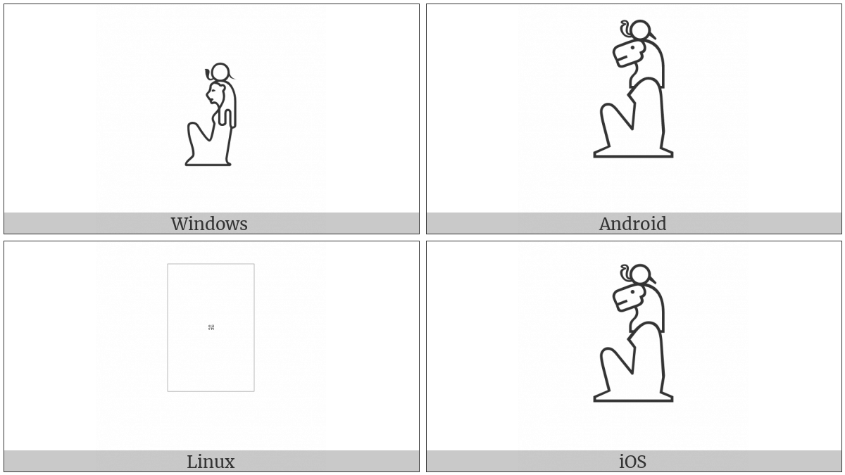 The image below shows how the “Egyptian Hieroglyph C023” symbol might look like on different operating systems. If the font in which this web site is displayed does not contain the symbol and there is no fallback font able to render it, you can use the image below to get an idea of what it should look like.