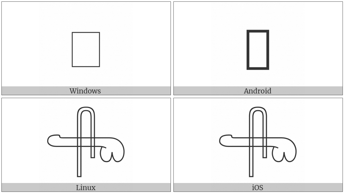 The image below shows how the “Egyptian Hieroglyph D052A” symbol might look like on different operating systems. If the font in which this web site is displayed does not contain the symbol and there is no fallback font able to render it, you can use the image below to get an idea of what it should look like.