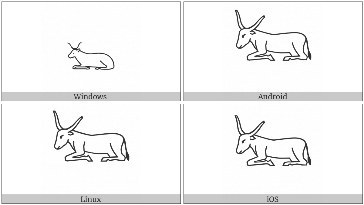 The image below shows how the “Egyptian Hieroglyph E009A” symbol might look like on different operating systems. If the font in which this web site is displayed does not contain the symbol and there is no fallback font able to render it, you can use the image below to get an idea of what it should look like.
