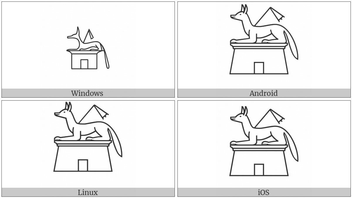 The image below shows how the “Egyptian Hieroglyph E016A” symbol might look like on different operating systems. If the font in which this web site is displayed does not contain the symbol and there is no fallback font able to render it, you can use the image below to get an idea of what it should look like.