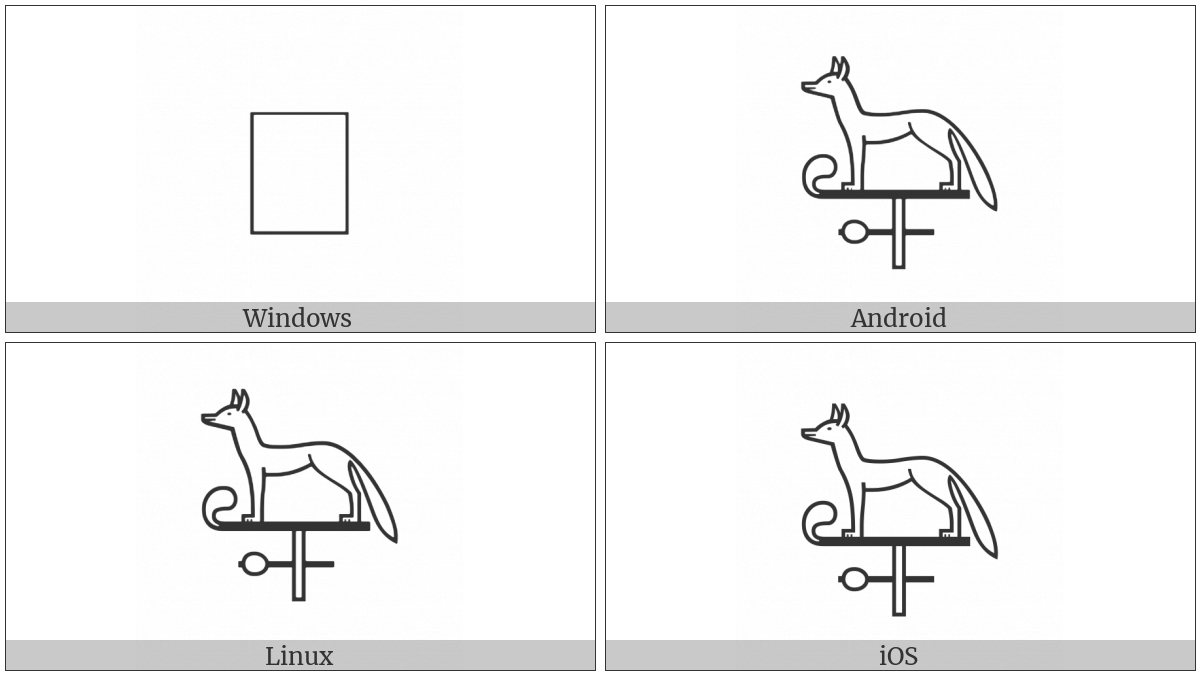 The image below shows how the “Egyptian Hieroglyph E019” symbol might look like on different operating systems. If the font in which this web site is displayed does not contain the symbol and there is no fallback font able to render it, you can use the image below to get an idea of what it should look like.