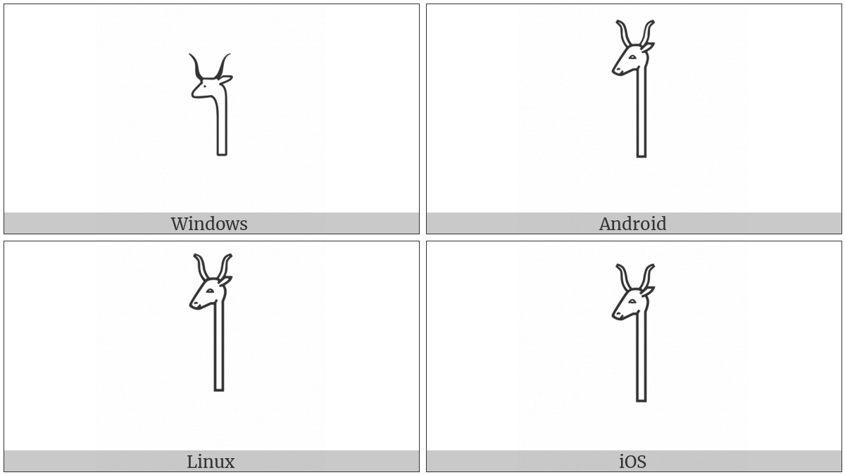 The image below shows how the “Egyptian Hieroglyph F011” symbol might look like on different operating systems. If the font in which this web site is displayed does not contain the symbol and there is no fallback font able to render it, you can use the image below to get an idea of what it should look like.