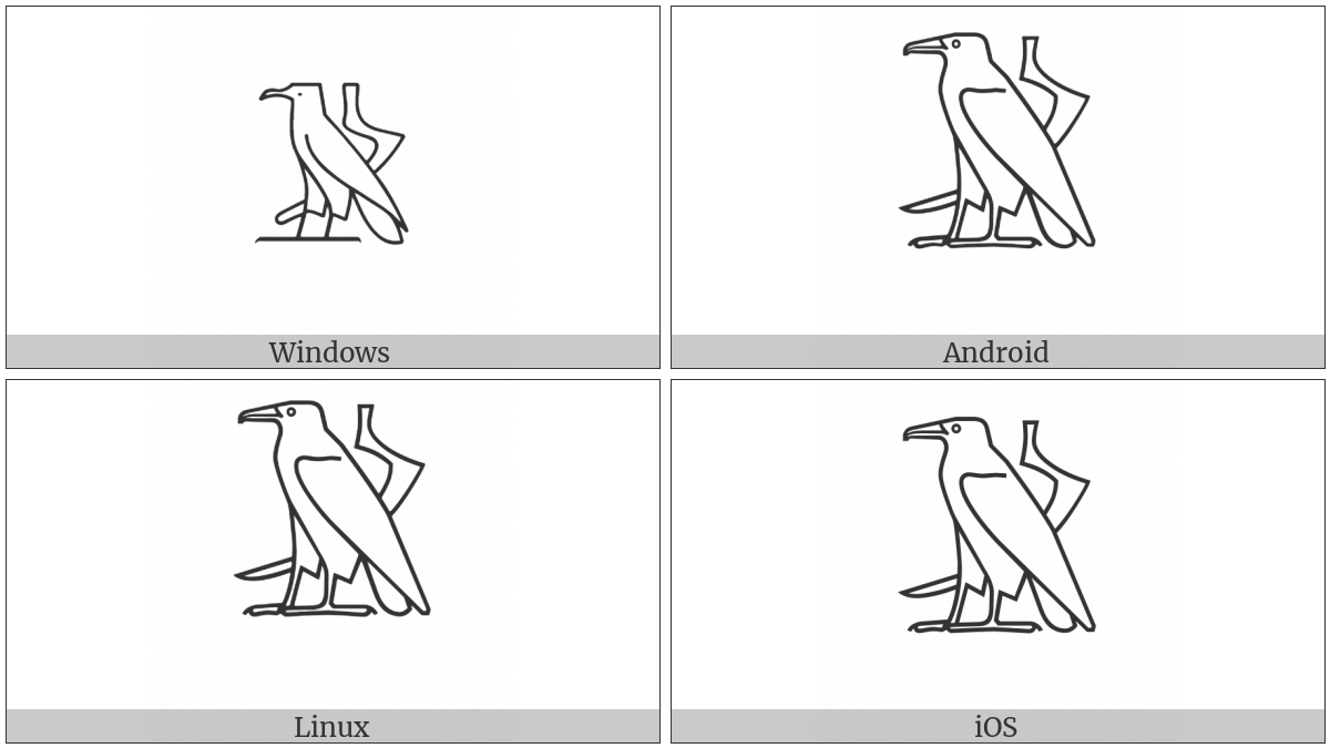 The image below shows how the “Egyptian Hieroglyph G003” symbol might look like on different operating systems. If the font in which this web site is displayed does not contain the symbol and there is no fallback font able to render it, you can use the image below to get an idea of what it should look like.