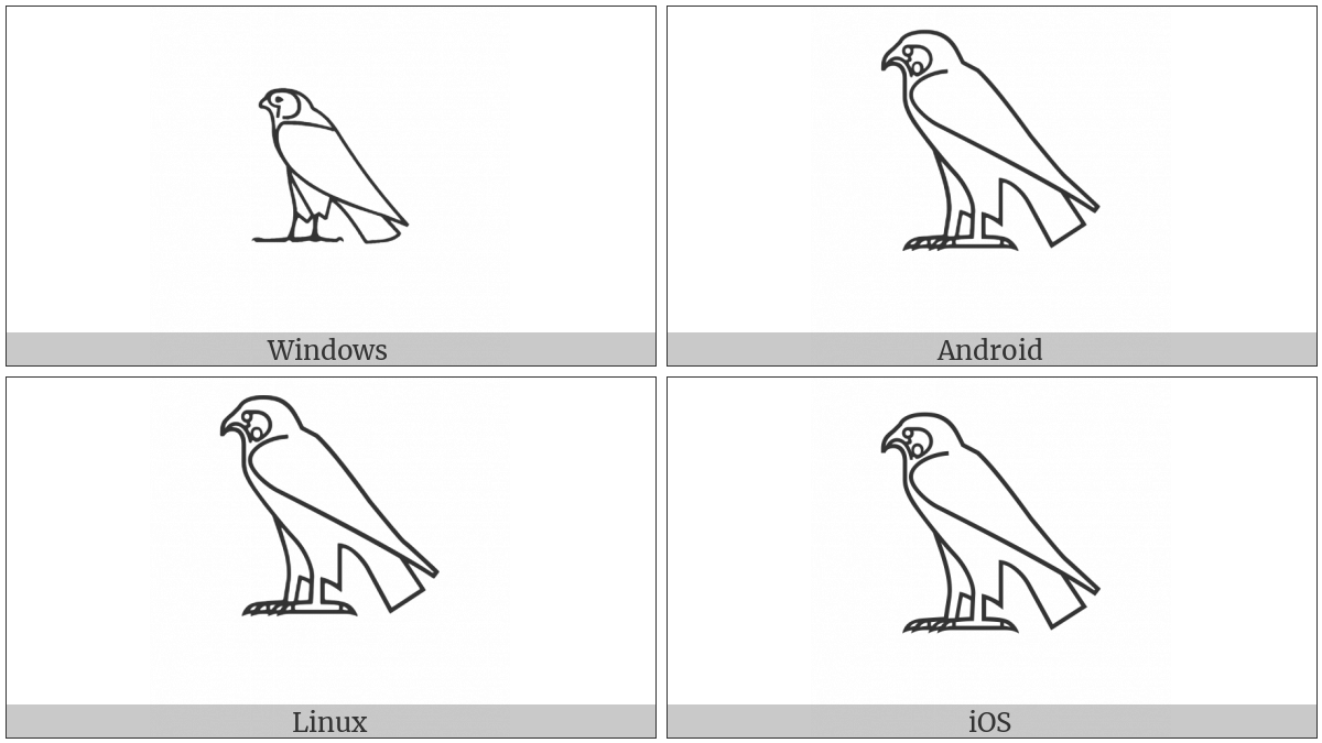 The image below shows how the “Egyptian Hieroglyph G005” symbol might look like on different operating systems. If the font in which this web site is displayed does not contain the symbol and there is no fallback font able to render it, you can use the image below to get an idea of what it should look like.